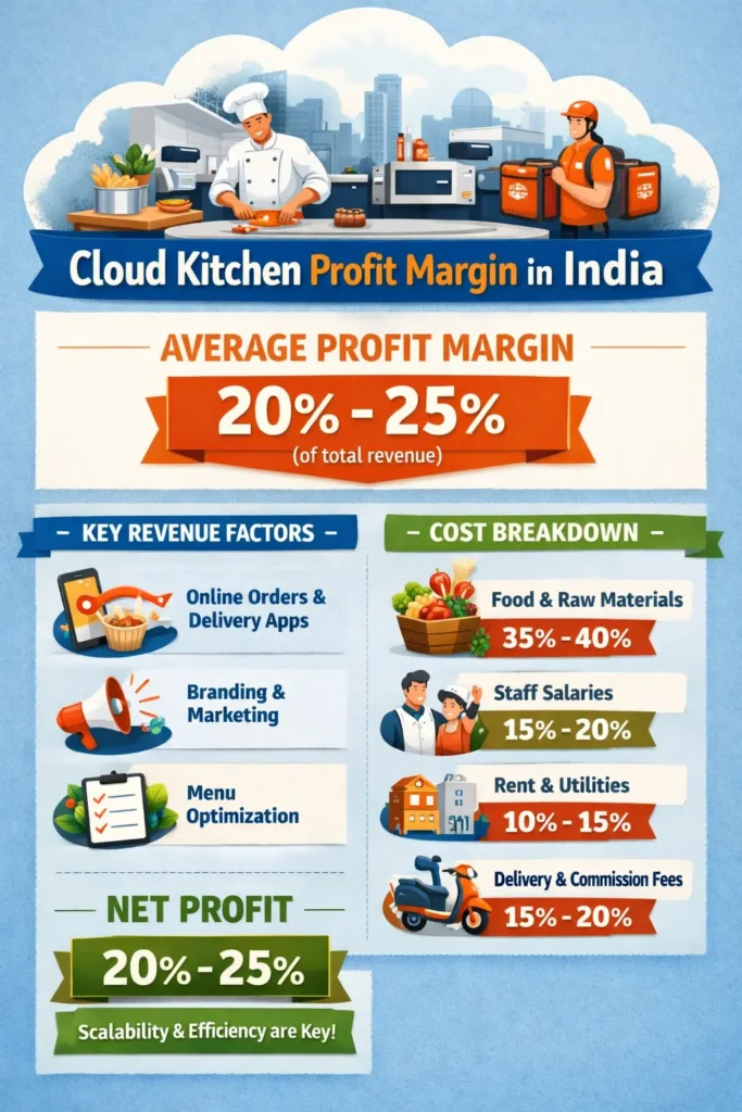 Starting a cloud kitchen is often promoted as a high-profit, low-investment business. But how much can you actually earn? What is the real cloud kitchen profit margin in India after expenses like commissions, rent, staff, and raw materials?